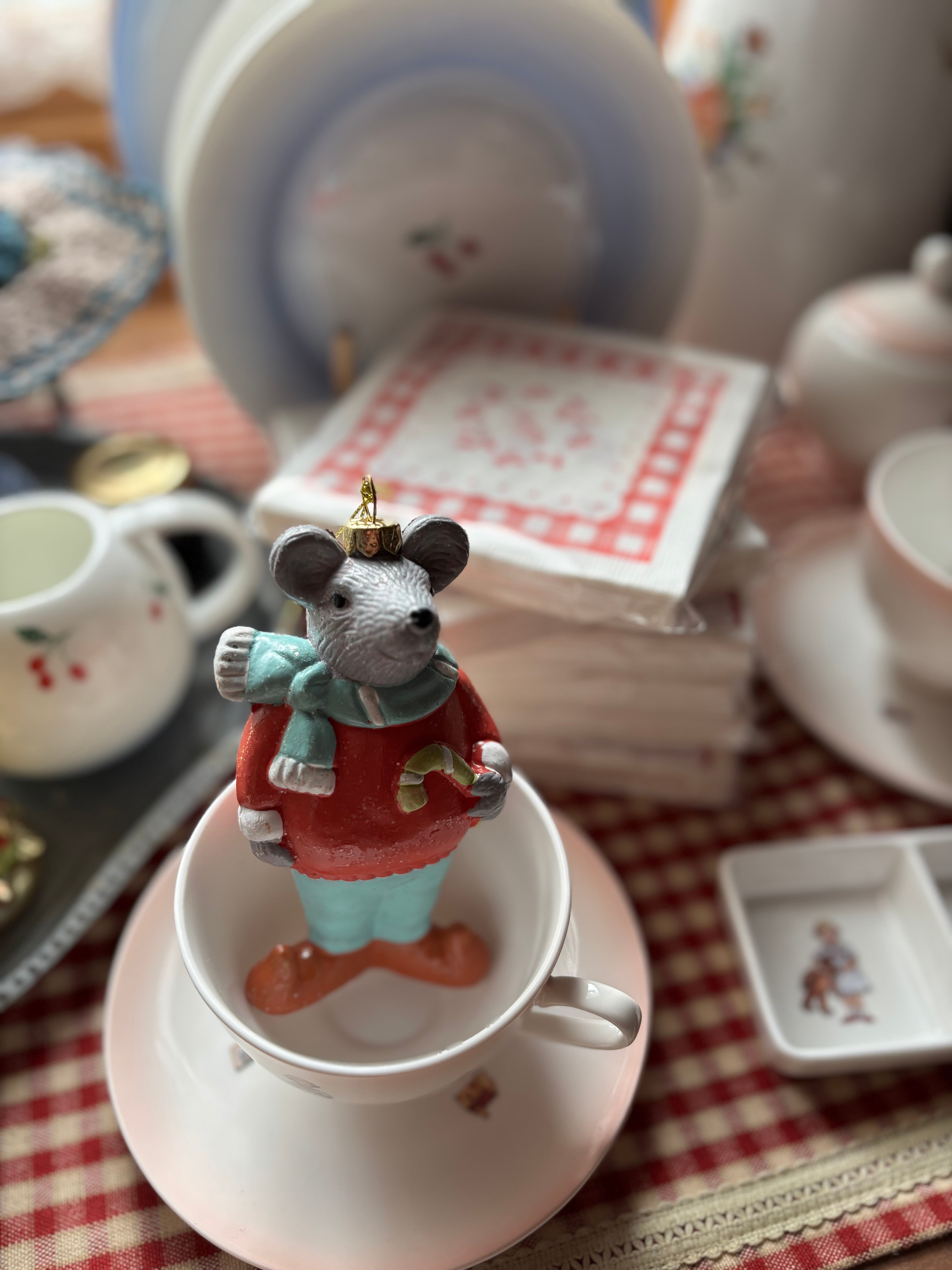 赤いお洋服に、水色のマフラーを巻いた可愛らしいマウスのオーナメント。