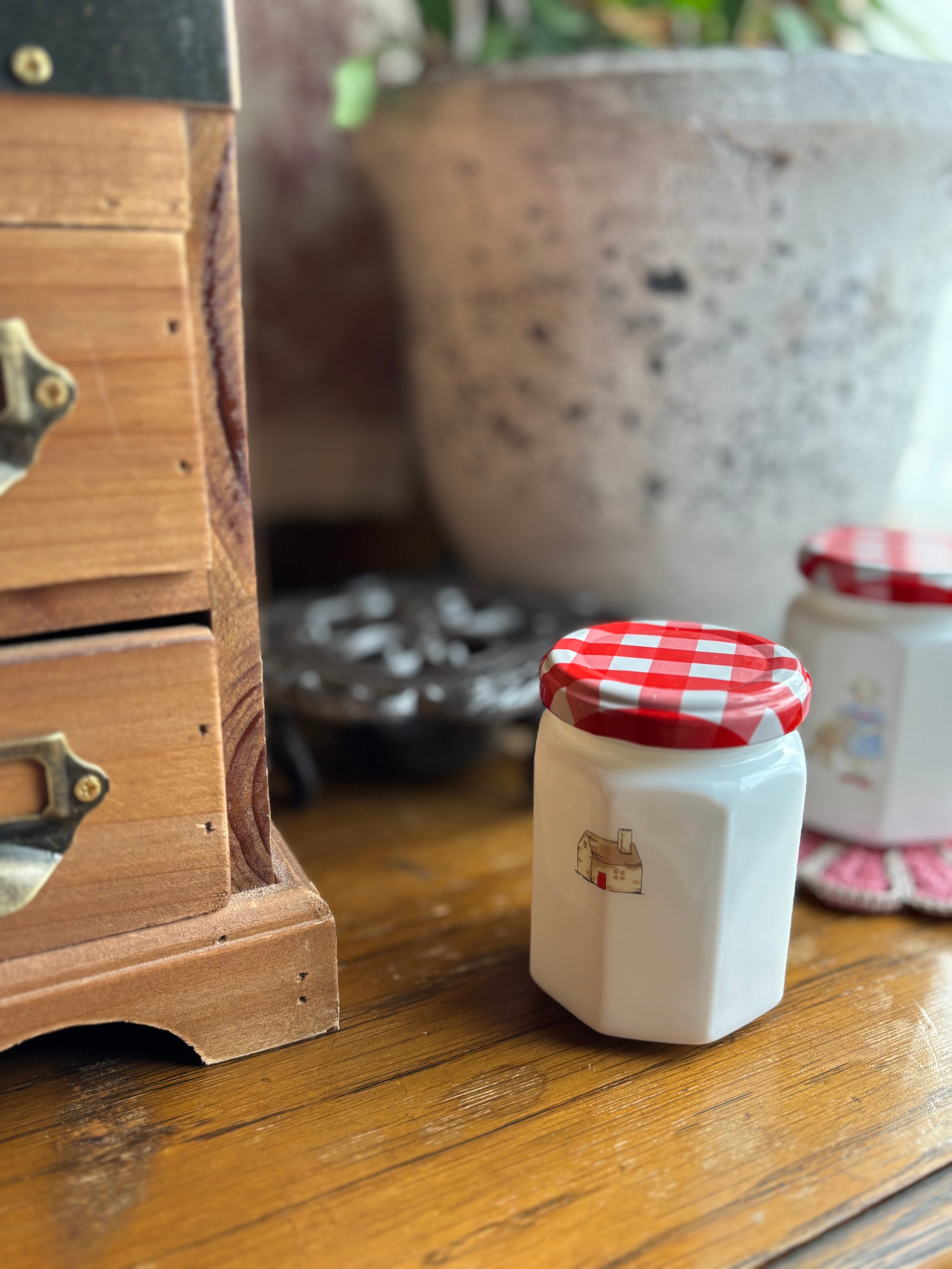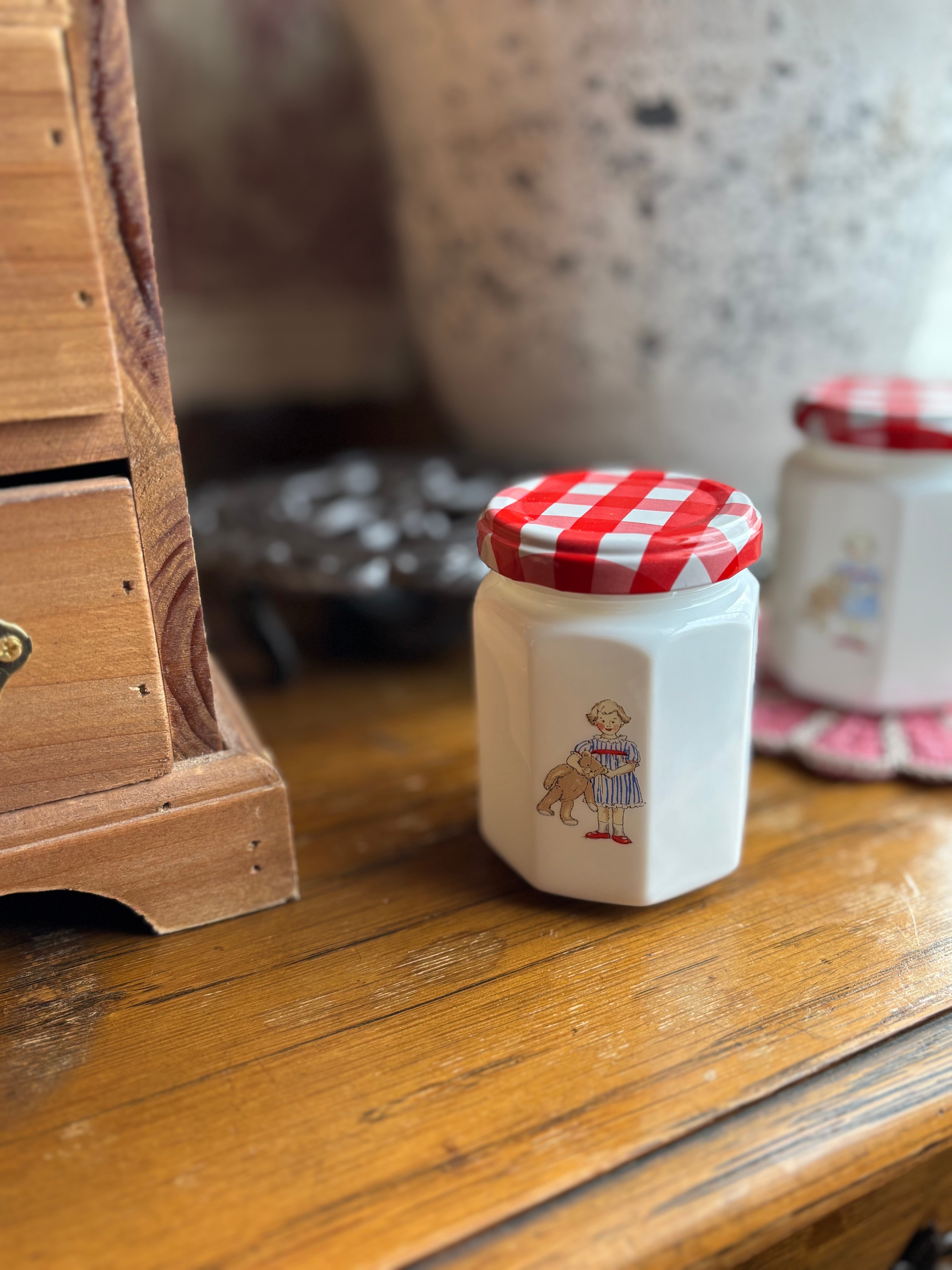 ミルクガラスのジャム瓶です。