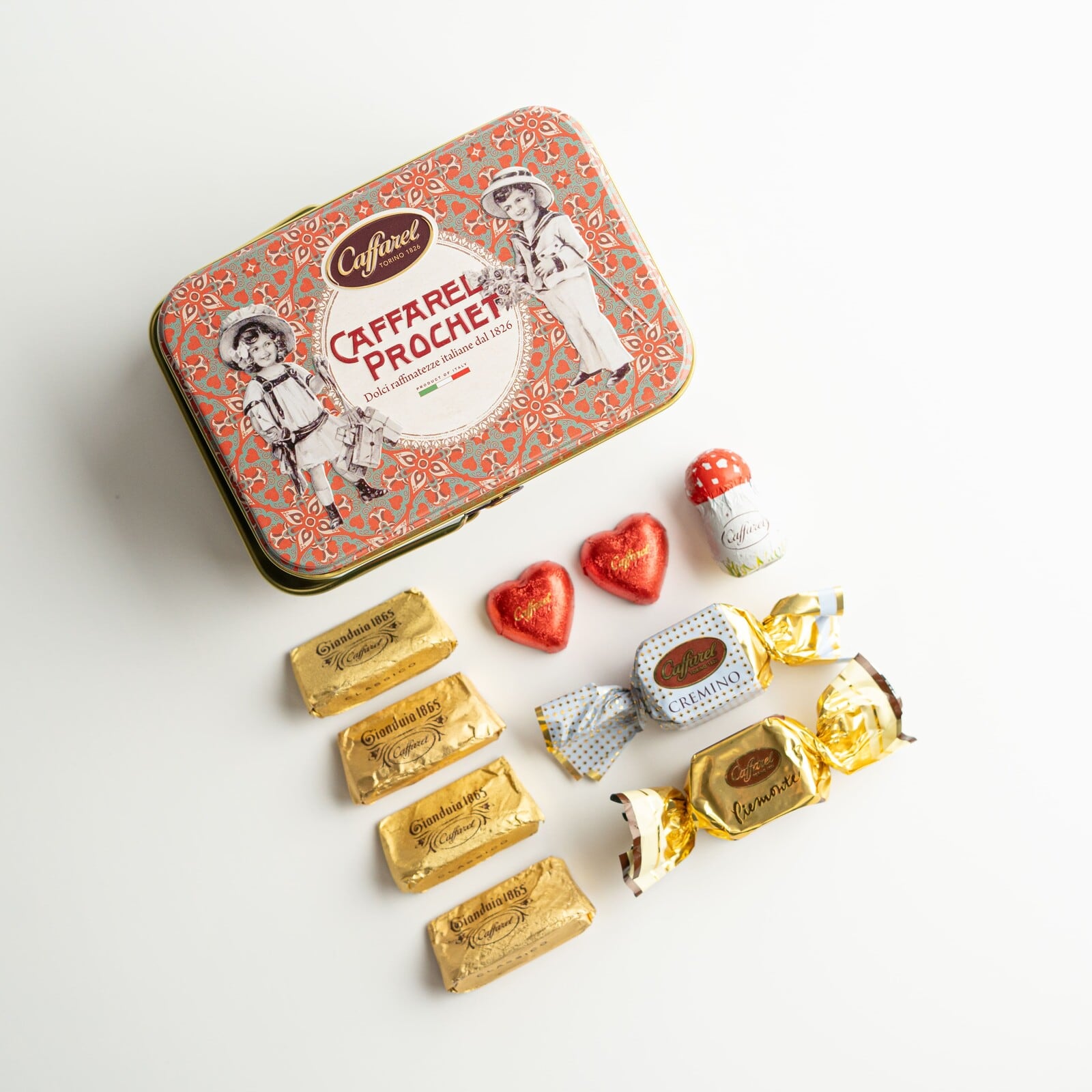 イタリアの豊かな芸術文化と一緒に生まれたカファレルのチョコレートが、まるでイタリアを旅したような気持ちにしてくれる、心ときめくバレンタインの世界観を表現します。カファレルの代表作、ジャンドゥーヤをはじめチョコレートを中心に全5種類9粒をアソートしました。